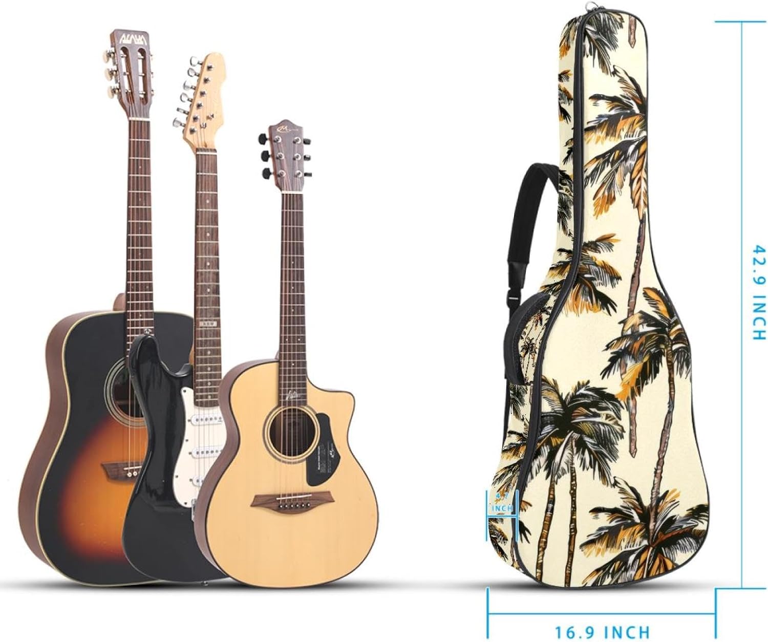 Specifications:Material: waterproof Oxford and waterproof zipper;Size: 42.9’’ x 16.9’’ x 4.7’’, perfect for 40'' 41'' 42'' guitar;Weight:36oz/1020g, lightweight;Color: Multi-color.Features:1. Adjustable backpack shoulder straps and padded side carry handle for more pleasant carrying choices.2. 10mm thick sponge padding inside provide protection for your musical instrument; and fixed Velcro above neck and body keep your acoustic guitar bag safer.3. This guitar bag comes with back hanger loop can be hung on the wall. Save more space when not in use.4. Two pockets for storage convenience, 1 large capacity pocket on outside back and 1 small pocket on the inside neck.5. Cute printed guitar gig bag guitar case backpack, ideal as a gift for your relatives or friends who love music when birthday, Thanksgiving, Christmas, holidays, and other special events.