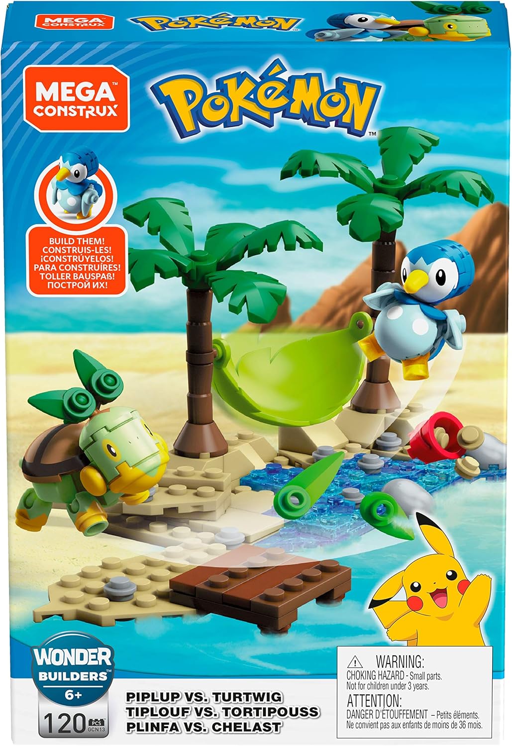 Build a bash at the beach when Piplup and Turtwig clash! Choose your Pokemon and battle to become the best! It's Piplup vs. Turtwig when you create your own action-Packed between these two opposing Pokemon! Build your Pokemon, set the scene for a battle, then launch into a mischievous attack with Turtwig to flip Piplup from his hammock and knock him straight into the water! Ideal for ages 6 and up