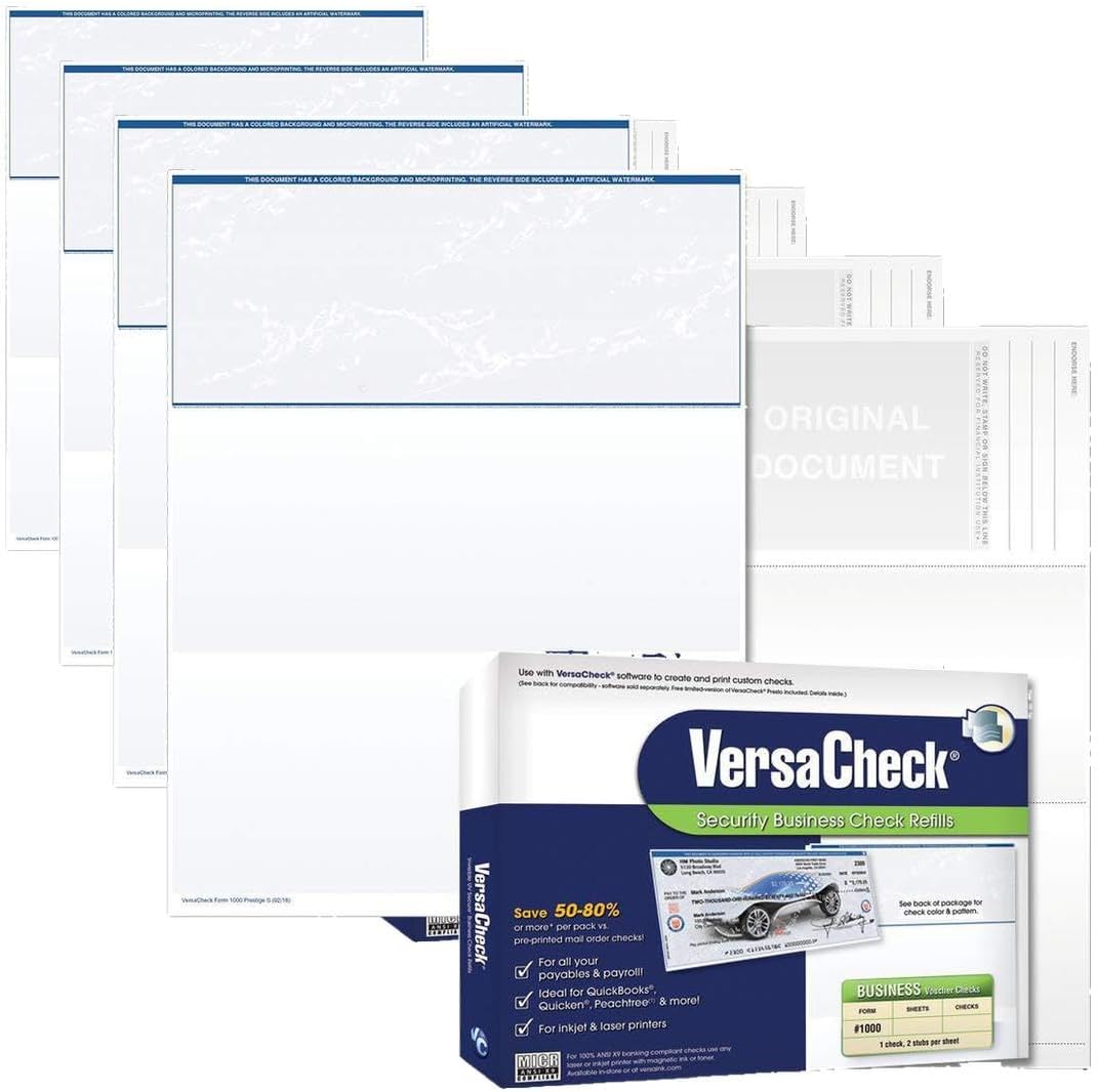 VersaCheck Form #1000 Business Voucher Refills are the perfect security blank voucher paper designed specifically to use with all VersaCheck software products (except personal versions) to comply 100% with ANSI X9 banking standards. High Security Blank Business Voucher Paper for payroll, accounts payable, security coupons and more – 100% compliant with ANSI X9 banking standardsSave 50-80% or more vs. pre-printed forms supplied by banks and mail order providers. Made in the USA.Includes VersaCheck® security Validation code for use with VersaCheck software and VersaCheckONLINEIncorporates advanced anti counterfeit features including warning bands, micro-print, security screens, artificial watermark, and other High Security anti-fraud featuresContains Letter size 8.5” x 11” (24lb) sheets of High Security blank form paper with one business-size voucher on top and two stubs below. Perforations at 3.5”, 7”, 10.5” from the top of each sheet.Works with any laser or Inkjet printer. VersaInk or VersaToner MICR recommended. Compatible with VersaCheck software, VersaCheckONLINE, QuickBooks, Quicken, XERO, NetSuite, Sage, Microsoft GP, MAS90, MAS 200 and more.Blank check paper offers extra storage security and the convenience of updating checking information at anytime. Includes matching print Validation code. Additional print codes included FREE in all VersaCheck Refill packages.